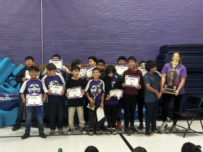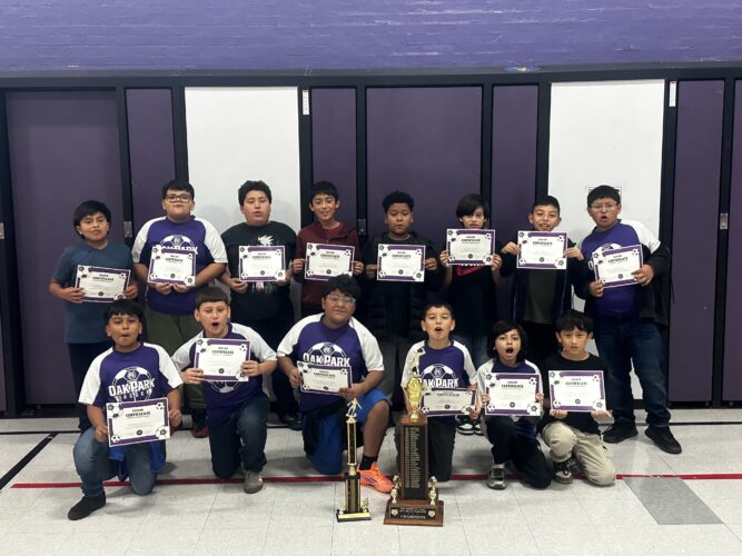 On Saturday, October 18th the Oak Park Soccer team won first place in the district soccer tournament. This is the second year in a row the team has won the tournament. On Friday, October 24th students attended a school-wide assembly to celebrate Mrs. Benavides and the winning team. The team will also be celebrated at the district board meeting on Monday, November 3rd.