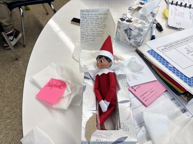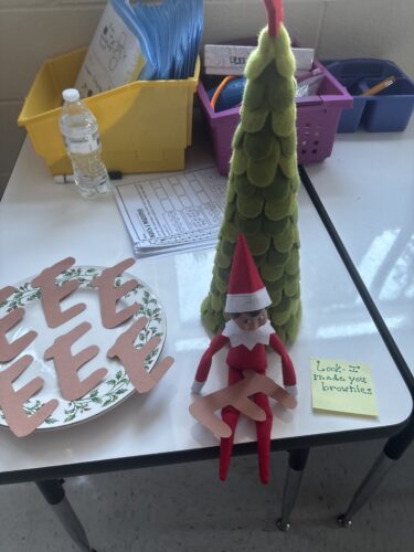 Many classrooms in Oak Park have been visited by elves to make sure the students are on the nice list this year. Some of the elves have been getting into mischief, while others have simply been hiding around the classroom. Take a look at some of our elf friends.