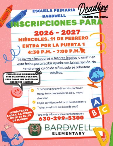 Por favor tómense un momento para inscribir a su hijo/a para el próximo año escolar 2026-2027.